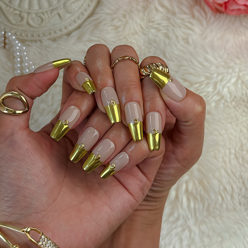 Step into the opulent world of Golden Mirage, where creamy nude shades elegantly ombre into brilliant gold accents, highlighted by subtle golden ring details for a modern, high-end sophistication.