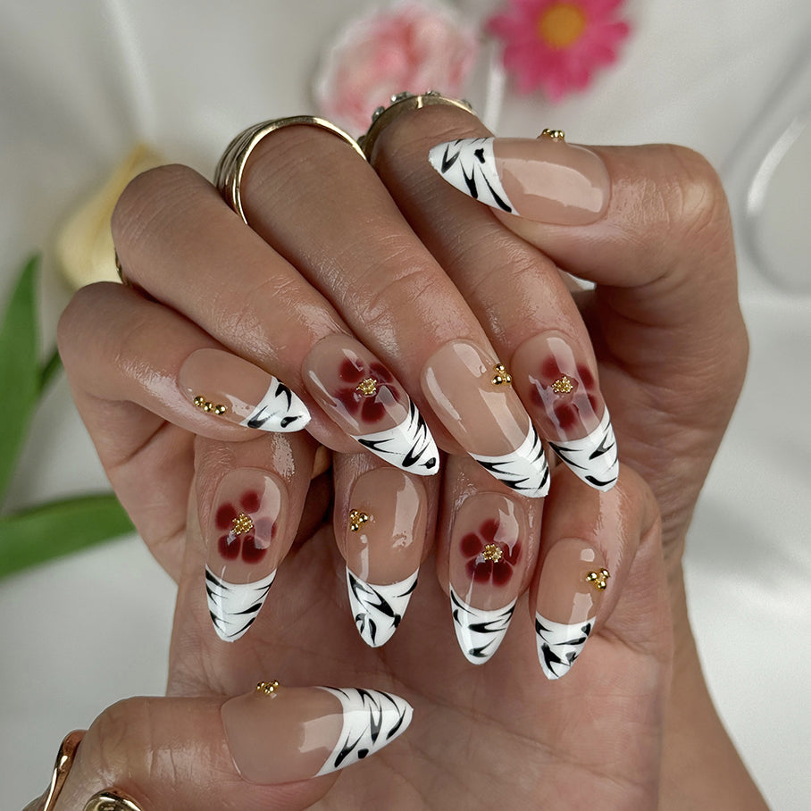 Nude french tip nails with a glossy nude base, crisp white tips, and soft floral accents—clean, romantic, and photo-ready.The medium almond fit elongates your fingers and feels comfortable all day.Minimal flower details and modern French tips keep it elegant—not busy—so it matches any dress.Perfect for summer weddings, bridal showers, and date nights—press on and you’re instantly put-together.