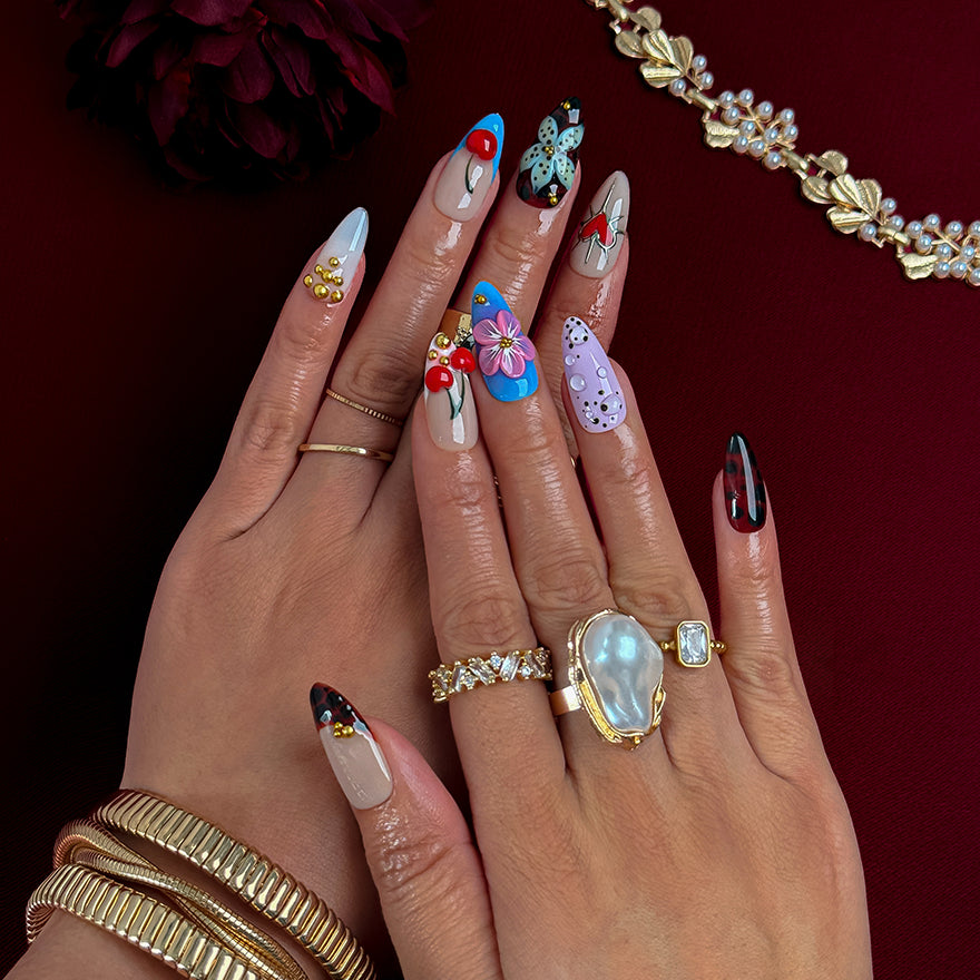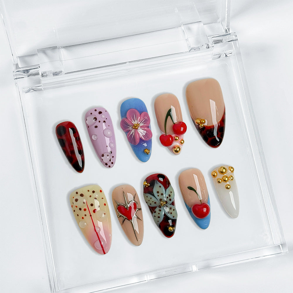 Handcrafted from premium gel and acrylic for a glossy, salon-grade shine that lasts up to 3 weeks. Apply in minutes, reusable across occasions, and fully customizable to your fit. Dive into this viral, mix-and-match collection that fuses sweet, bold, and whimsical vibes – salon artistry at your fingertips!