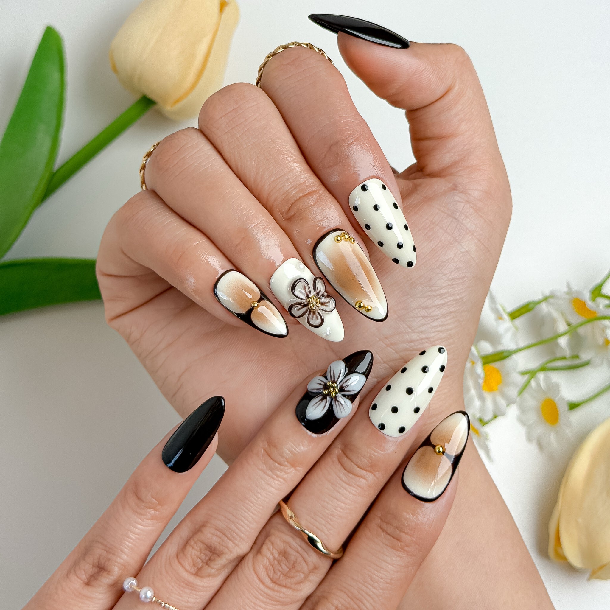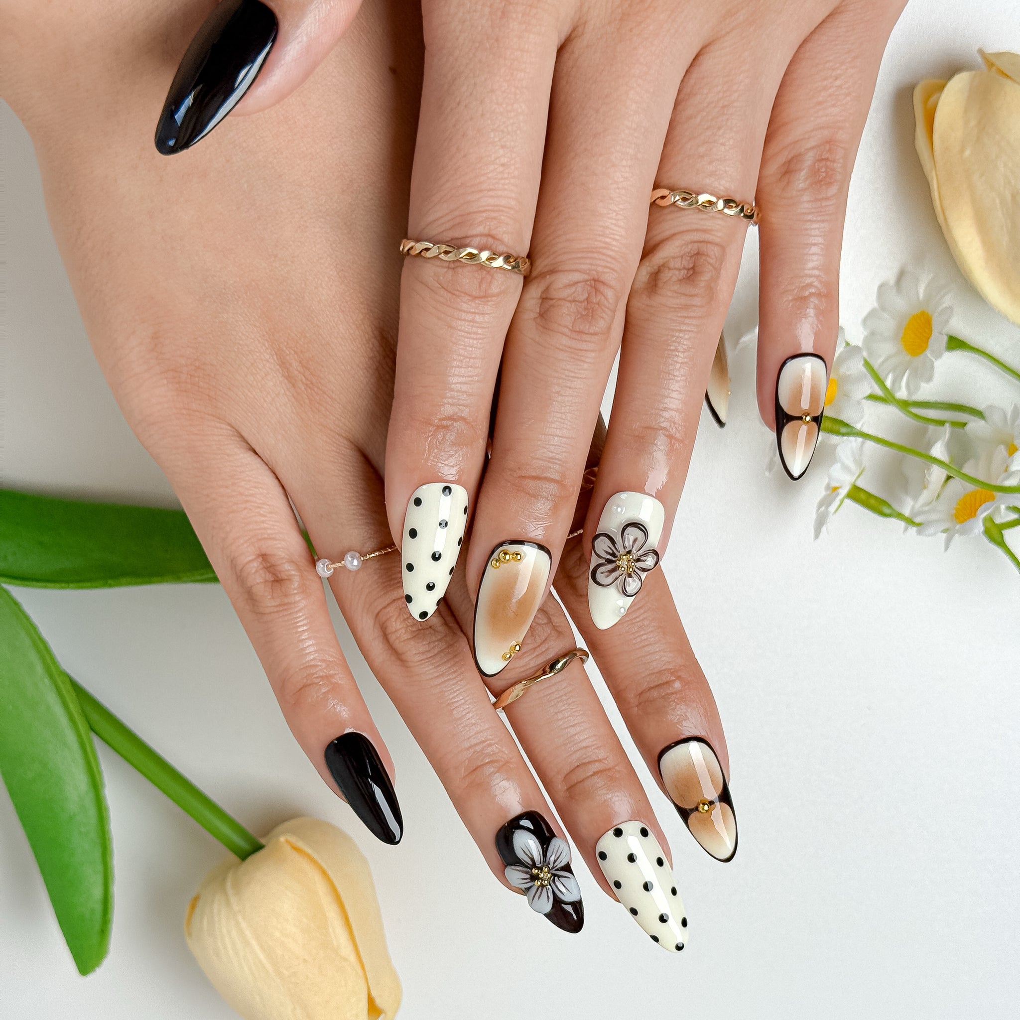 Nail art in gold with a rich fall palette—this medium almond set blends glossy espresso black, creamy white, and warm brown ombré tones with delicate floral accents, playful polka dots, and tiny gold bead details for a look that feels elegant, cozy, and holiday-ready. Perfect for fall outfits and elevated seasonal styling, it delivers a polished salon-style finish with a chic vintage-luxe vibe.