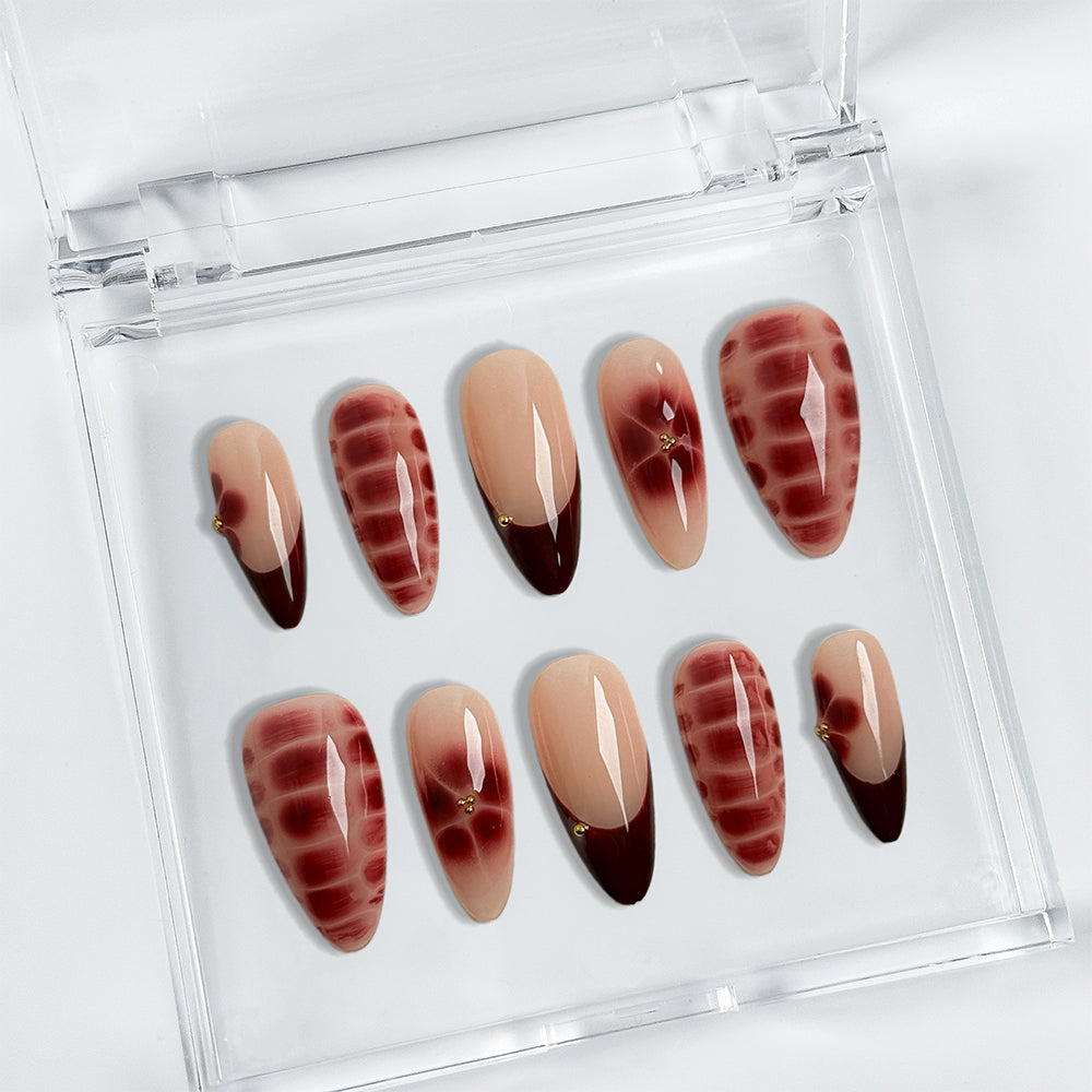 Skillfully handcrafted from top-grade gel and acrylic, ensuring a stunning, high-shine salon finish that holds for up to 3 weeks. Effortless application in minutes, reusable across multiple looks, and customizable to your unique fit. Dive into these exclusive, fashion-forward creations that mix earthy warmth with untamed flair – professional results right at your fingertips!