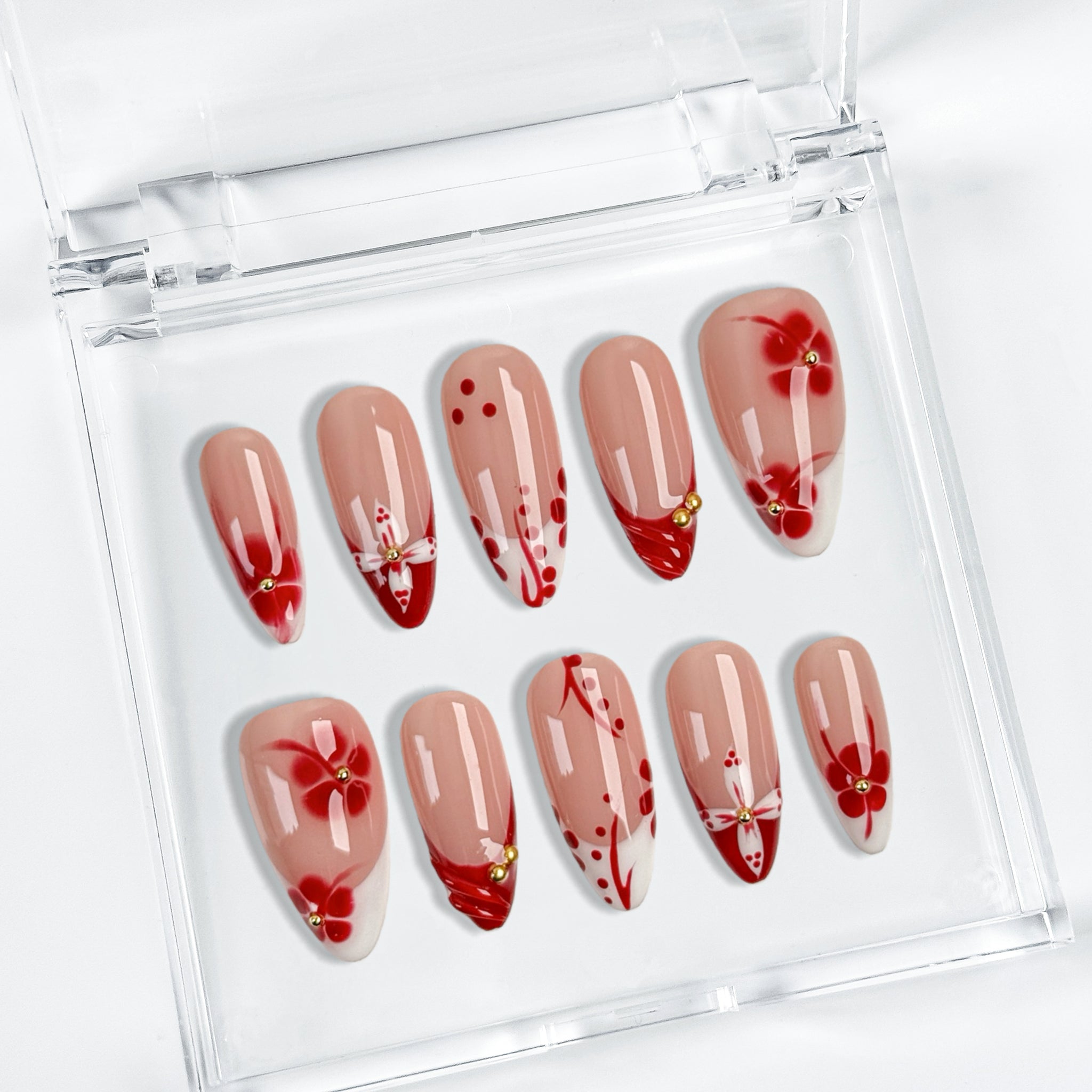Simple nail art designs with a fresh summer twist—this medium almond set features a soft nude base with vibrant red floral accents, playful petal details, and glossy red-and-white French-inspired tips for a look that feels feminine, fun, and photo-ready. Perfect for beach parties, summer trips, and sunny-day outfits, it gives you an easy statement manicure with a polished salon-style finish.