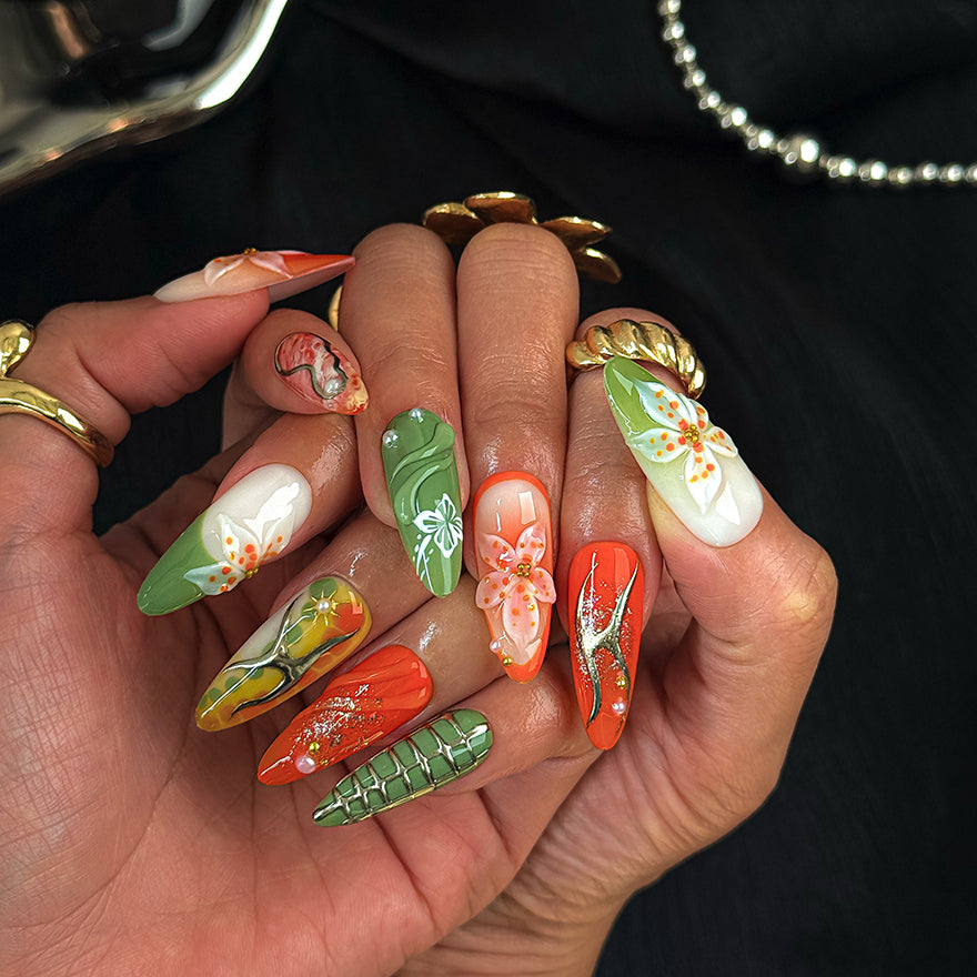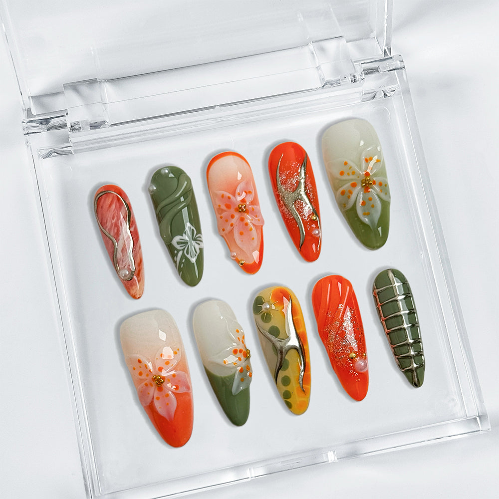 Handcrafted from premium gel and acrylic, delivering a high-shine, salon-grade finish that lasts up to 3 weeks. Snap on in minutes, reusable for multiple wears, and fully customizable to your fit. Unleash these exclusive, trend-dominating designs that fuse bold ombres with metallic and floral drama – instant vibrancy without the salon wait!
