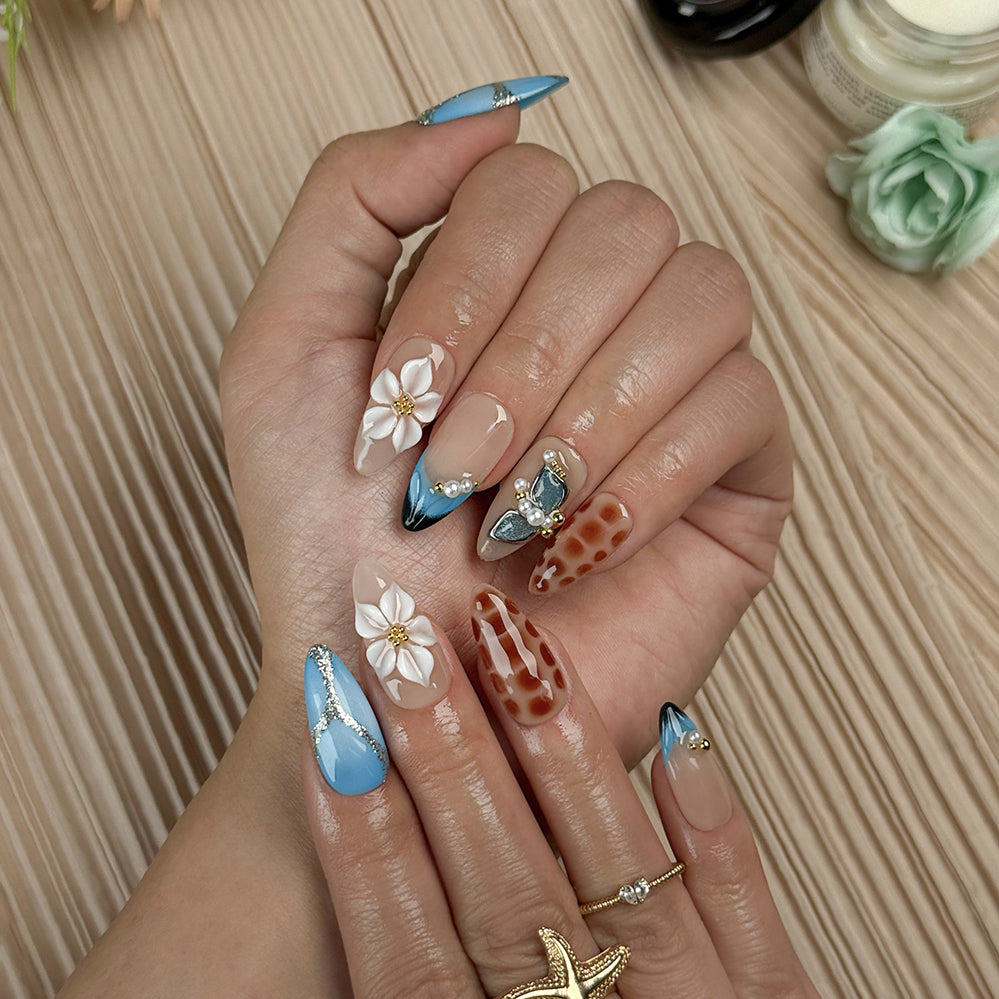 Blue floral nails with ocean-blue pops, warm brown accents, and a clean nude base—luxury, fresh, and made for photos.The medium almond fit elongates your fingers and feels easy for all-day wear.Statement flower nails with pearl-like accents and subtle shimmer give a custom-salon look in minutes.Perfect for summer trips and holiday events—pairs with dresses, denim, and gold jewelry.