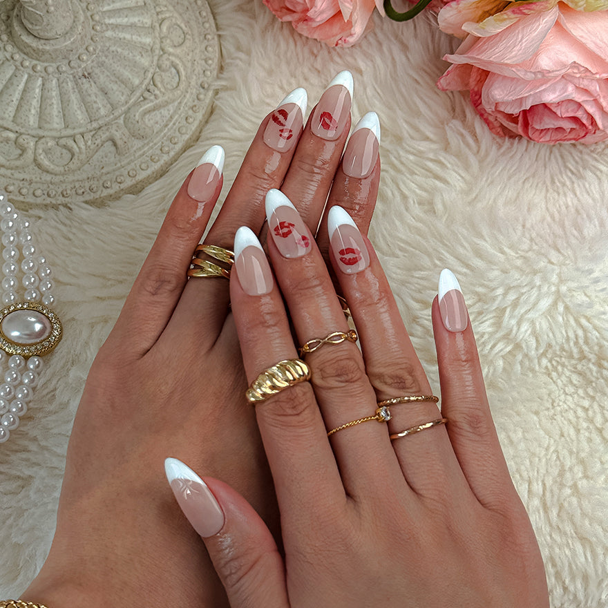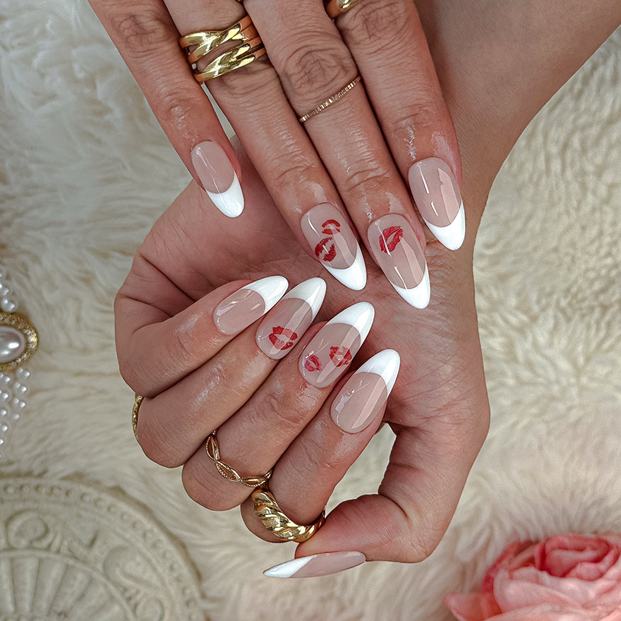 Surrender to the playful allure of Blush Kiss French, where soft nude bases meet pristine white French tips, accented by bold red lip motifs with glossy shine for a coquettish, love-inspired sophistication that blends classic elegance with cheeky charm.