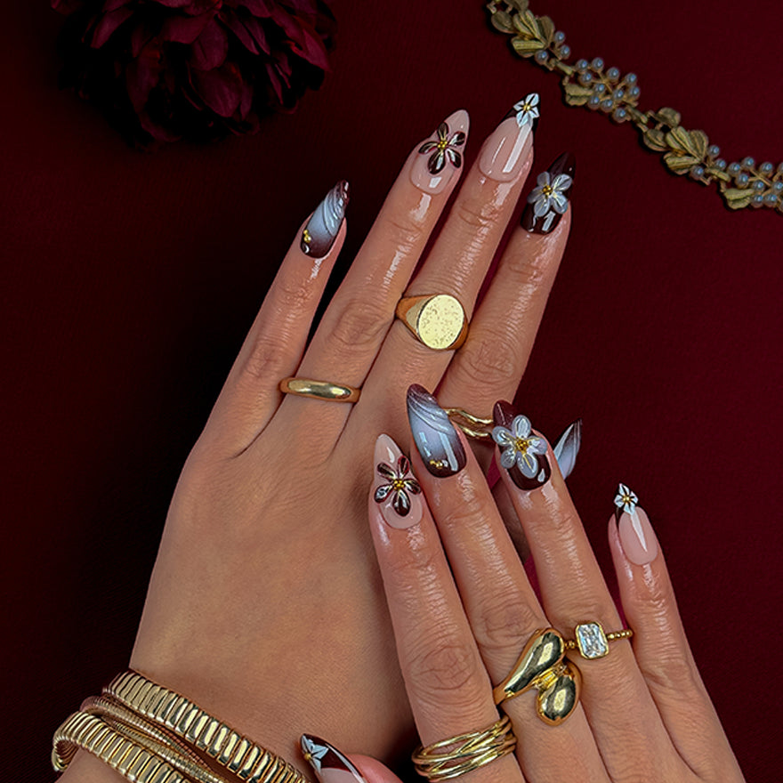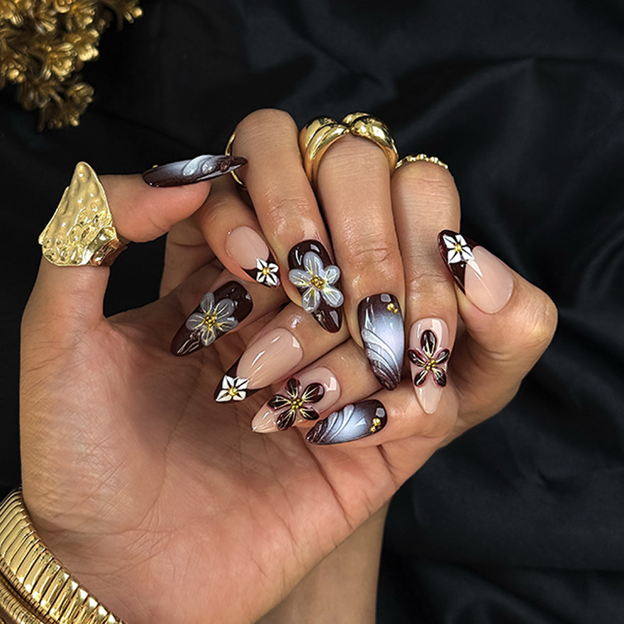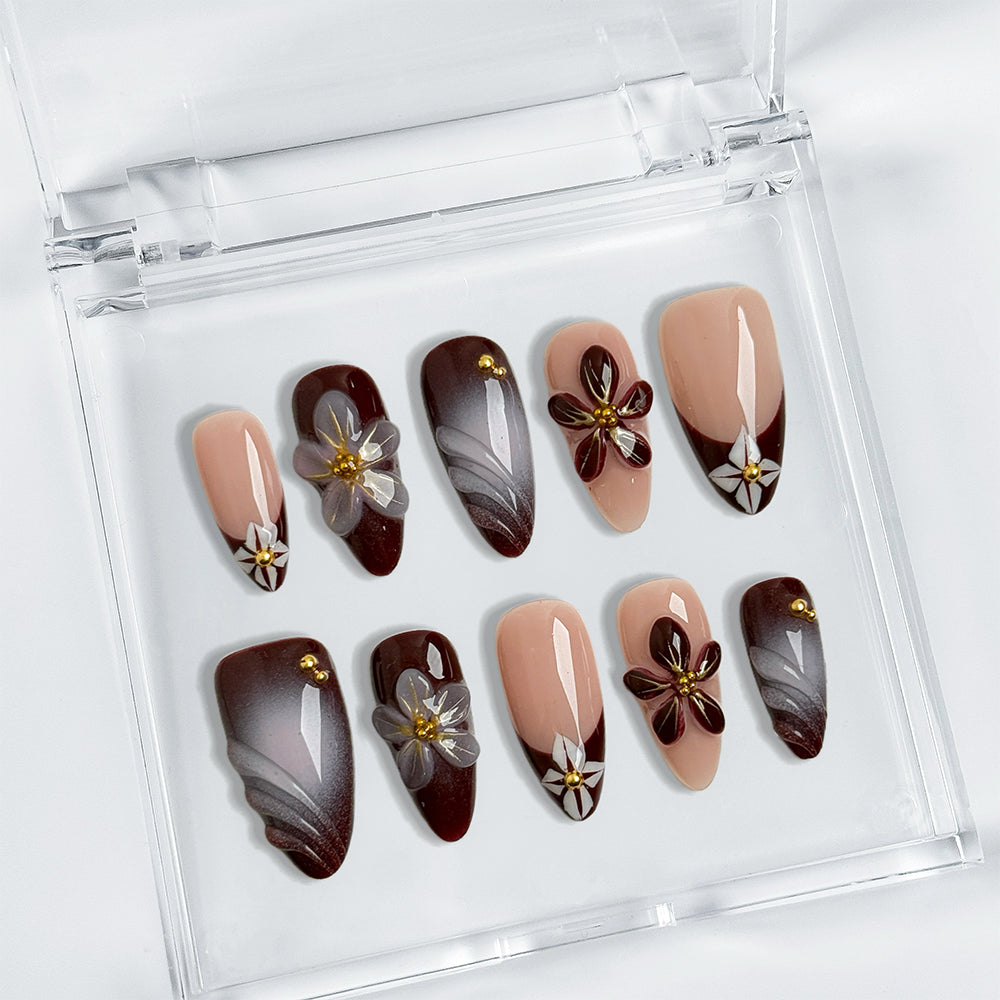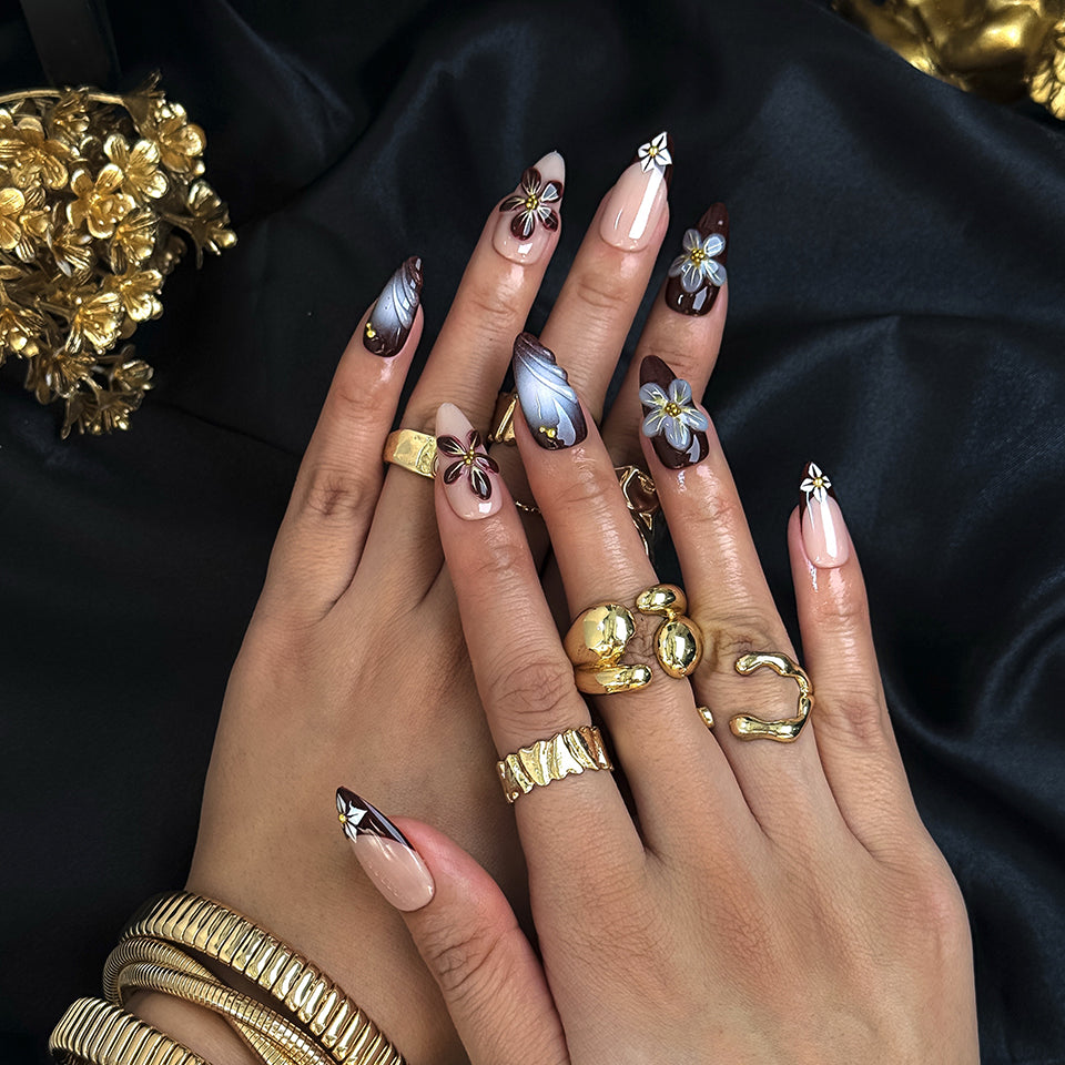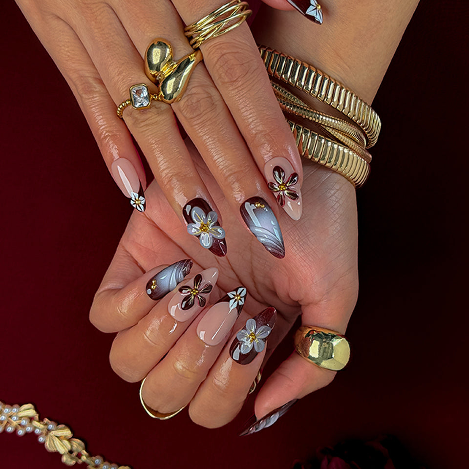 Precisely crafted from high-quality gel and acrylic, offering a radiant, professional salon gloss that withstands up to 3 weeks. Apply effortlessly in minutes, reusable for various occasions, and adaptable to your precise fit. Indulge in these bespoke, style-icon designs that merge rich depth with ethereal floral grace – salon sophistication delivered straight to you!