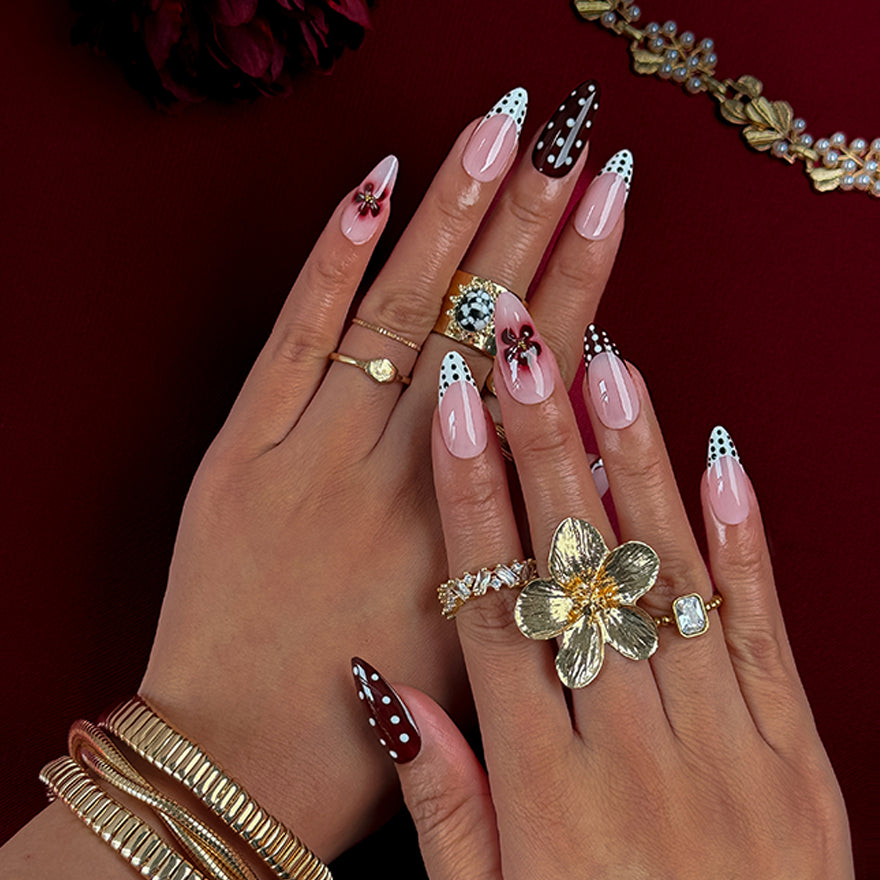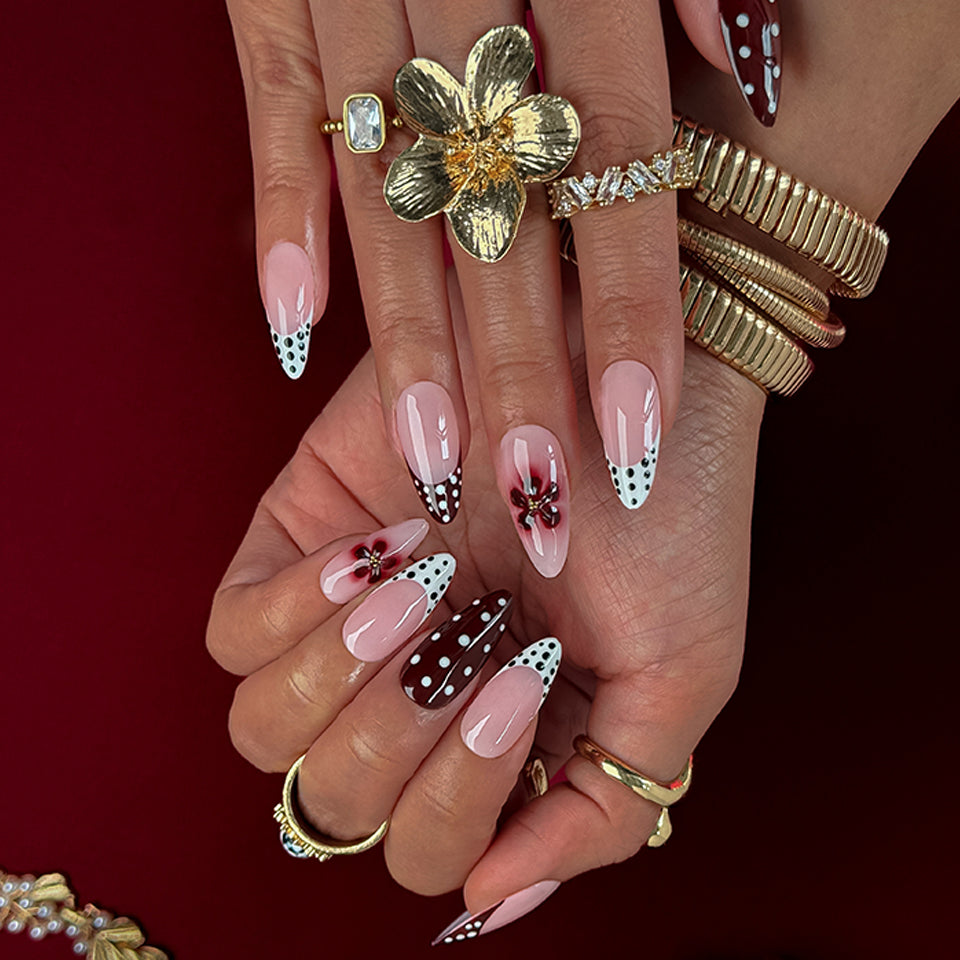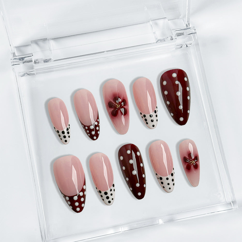 Fall for the sweet retro vibe of Cherry Polka Bow, where rich burgundy French tips blend into blush pink gradients, sprinkled with crisp white polka dots and topped with 3D glossy red bows for a flirty, pin-up inspired elegance.