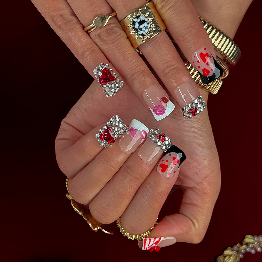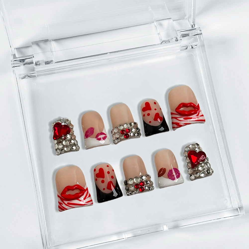 Hand-sculpted from premium gel and acrylic, sealing in a mirror-finish salon shine for up to 3 weeks. Snap on in moments, reusable for every mood, and trimmable to your perfect fit. Own these limited-run, influencer-coveted designs that fuse bold lips with luxe sparkle – instant queen energy, no salon required!