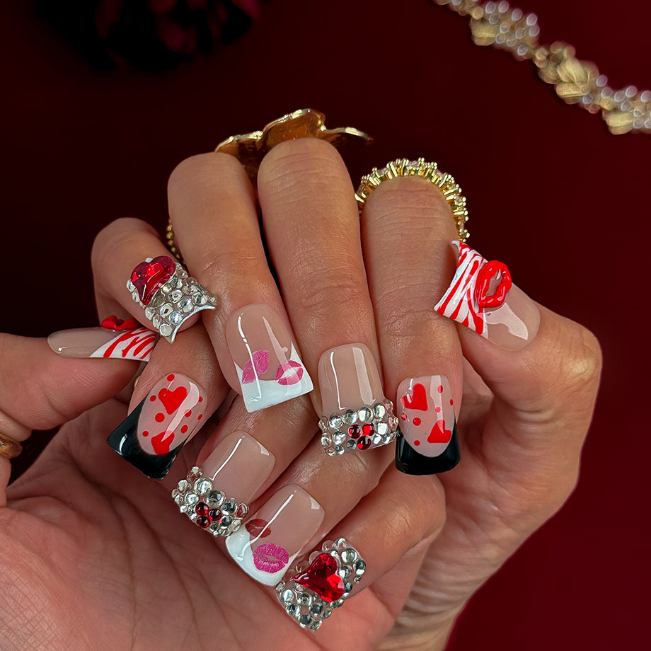 Command the spotlight with Crimson Kiss Royale, where soft nude fades into midnight black, kissed by glossy red lips, 3D heart jewels, wild zebra lines, and sparkling crystal clusters for a fearless, passion-charged glamour.