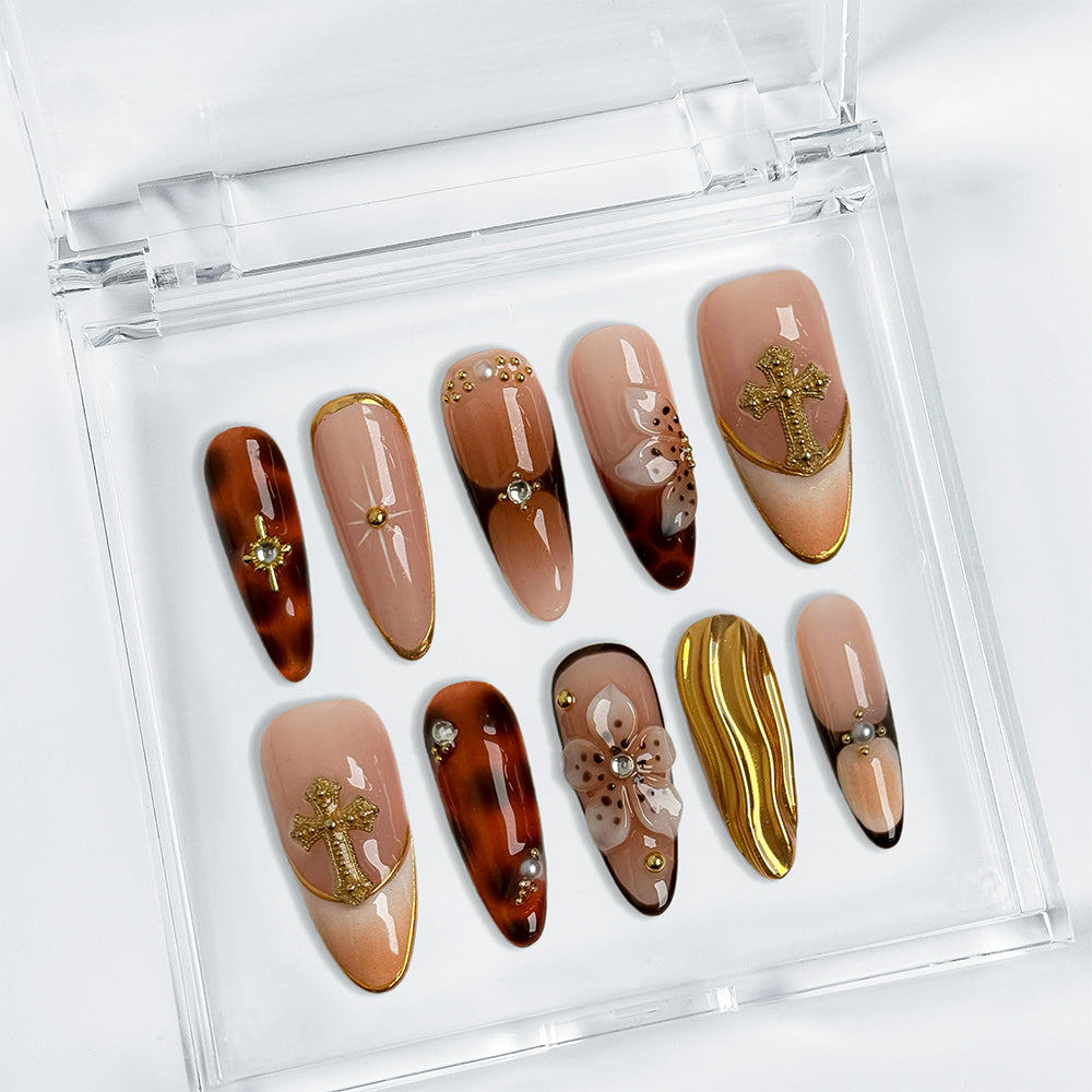 Embrace the divine warmth of Tortoiseshell Amber Cross, where creamy nude bases fade into deep tortoiseshell patterns with wood-like stripes, featuring ornate gold cross charms, hand-sculpted 3D amber flower motifs, subtle rhinestone studs, and golden edge details for a sophisticated, spiritual sophistication that merges earthy textures with sacred sparkle.