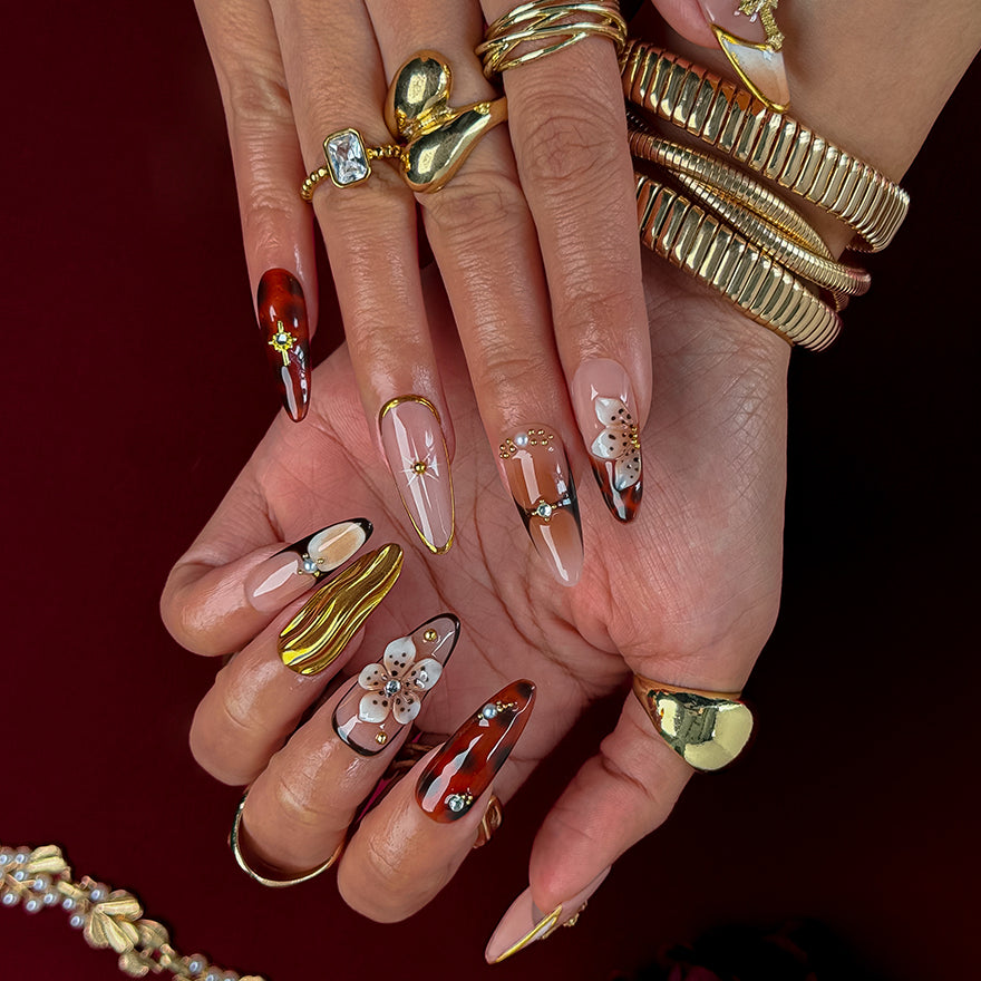 Handcrafted from premium gel and acrylic, delivering a high-shine, salon-grade finish that lasts up to 3 weeks. Snap on in minutes, reusable for multiple wears, and fully customizable to your fit. Unleash these exclusive, trend-dominating designs that fuse natural patterns with opulent symbols – instant grace without the salon wait!