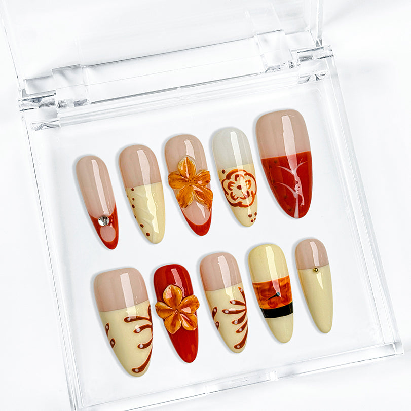 Orange red nail colors blend vivid reds and sunny oranges over a nude base, accented with hand-painted floral details for a lively, beach-ready look.The long almond nails provide a flattering shape that elongates your fingers while remaining comfortable for everyday wear.Each nail features intricate flower details, enhancing the playful color palette and adding a springtime, tropical vibe.These colorful floral nails are ideal for beach parties, spring outings, and warm-weather celebrations.