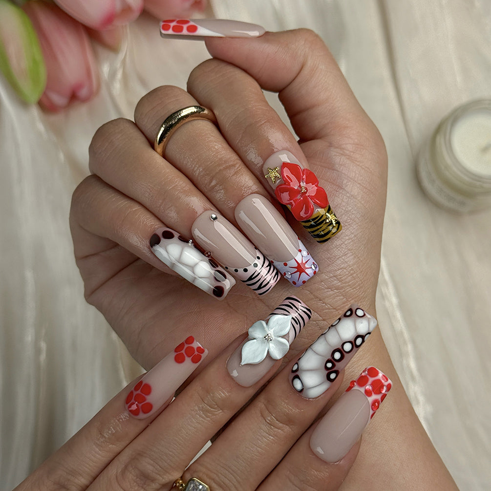 Red and white nail art with a glossy nude base, bold red accents, and playful color hits—bright, fun, and made for pics.The long square silhouette gives a sleek, modern look that instantly feels more dressed up.Statement flower nails and mixed patterns add that custom-salon vibe without the appointment.Made for spring weekends and beach parties—pairs with swimwear, sundresses, and denim.