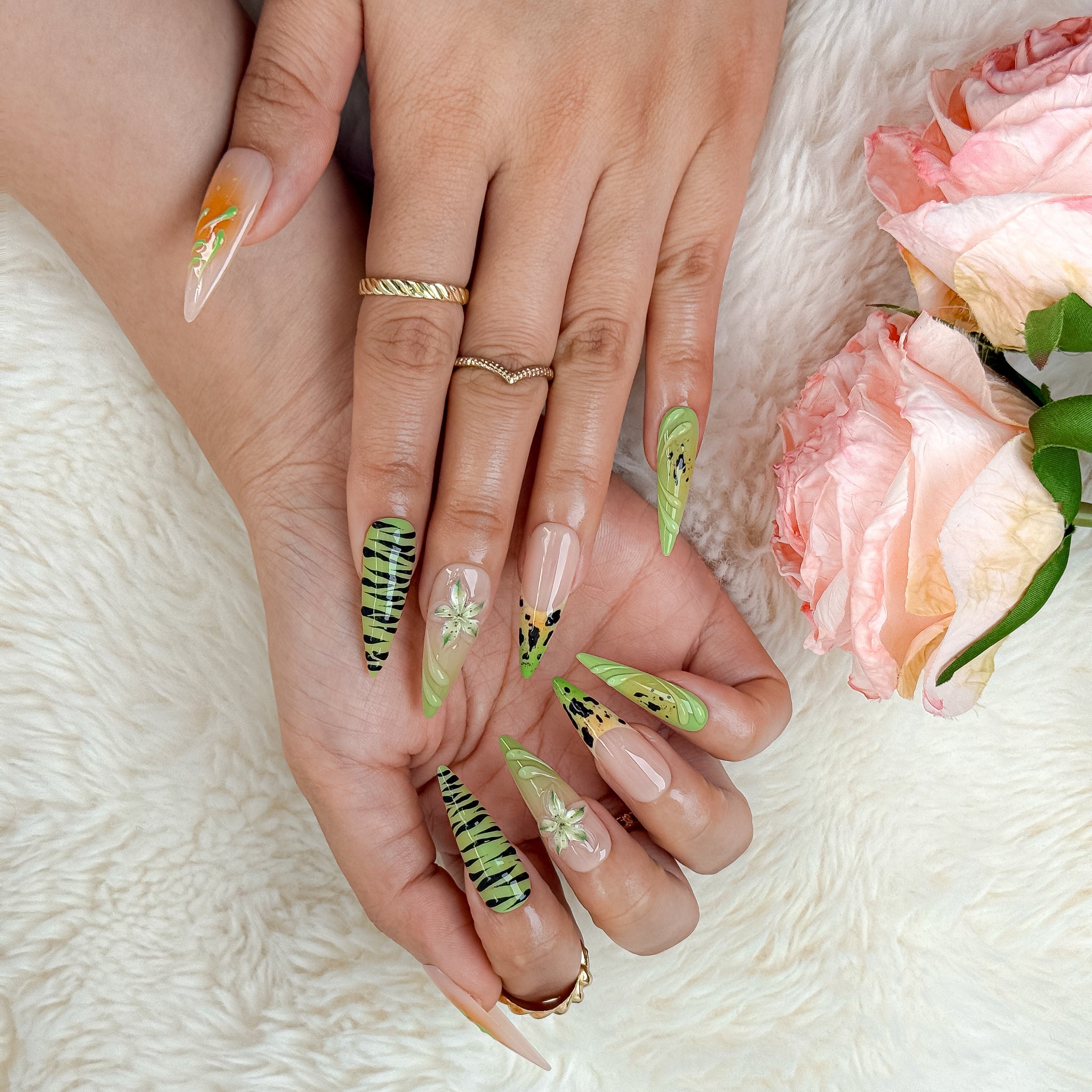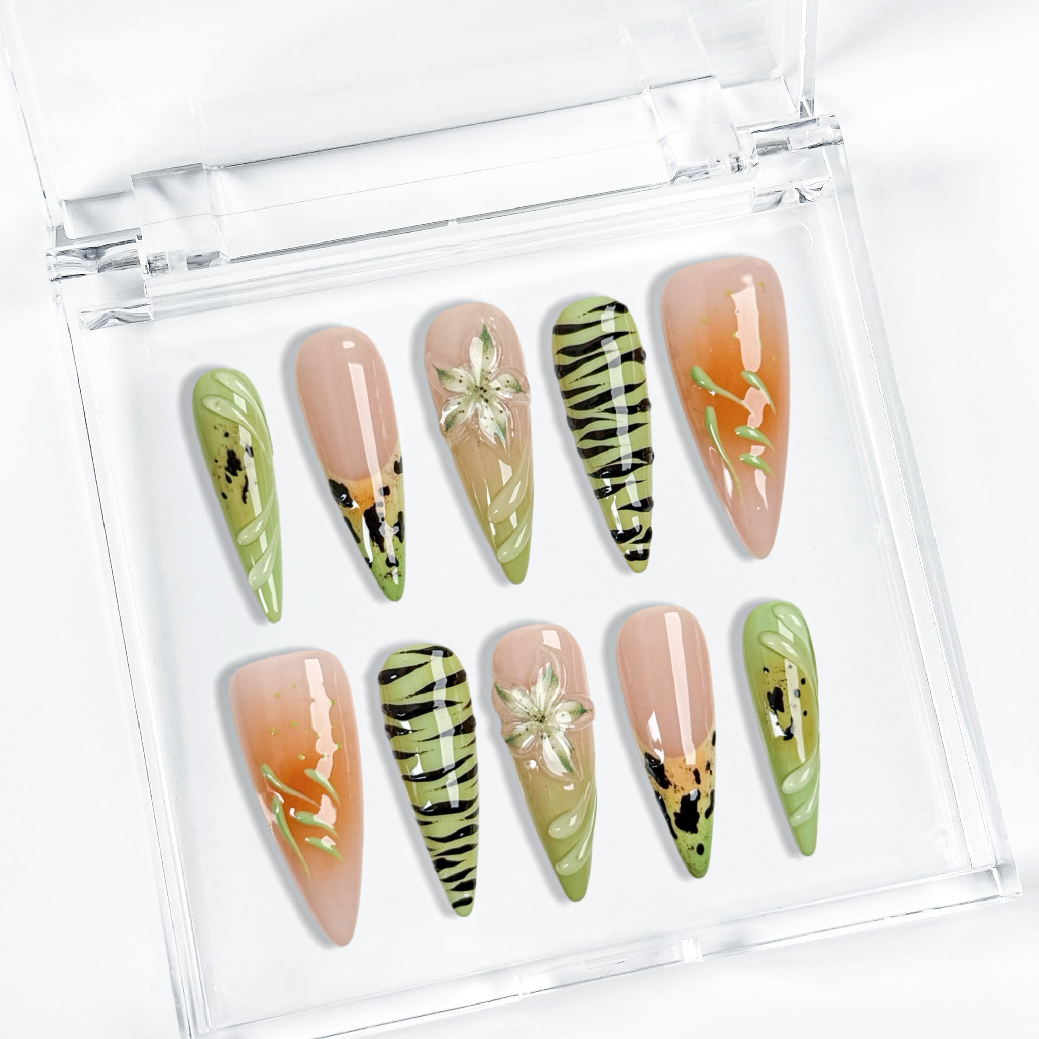 Sage green nails almond inspired styling gets a bold tropical upgrade in this long stiletto set, featuring soft nude bases, sage green tones, orange accents, zebra-inspired striping, and delicate floral details for a fresh, colorful look that feels playful, edgy, and beach-party ready. Perfect for spring vacations, sunny outfits, and statement moments, it delivers a glossy salon-style finish with a vibrant resort vibe.
